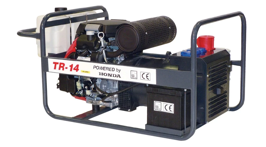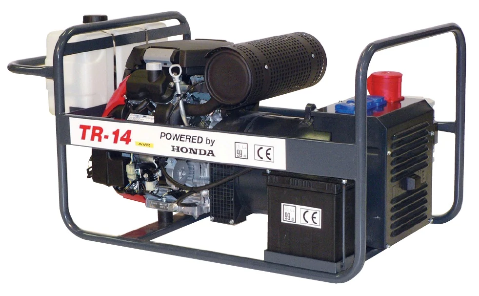 Elektronikus feszültségszabályzású generátor. Max. teljesítmény: három fázis: 14 kVA, egy fázis: 3 x 4 kVA, Motor: HONDA GX-630