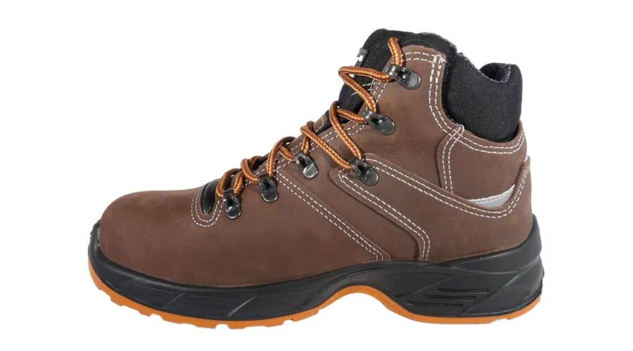 Styler (S3+SRA) könnyű, vízlepergető bőr munkavédelmi bakancs, barna, jólláthatósági betét, olaj- és saválló, antisztaikus, kopásálló, SRA csúszásmentes kétrétegű PU talp, kompozitkapli (12) és fémmentes talplemez