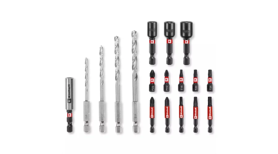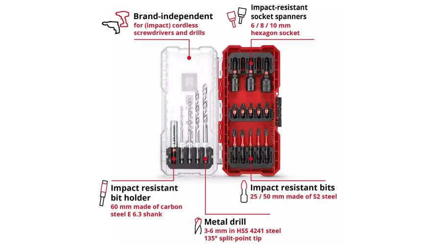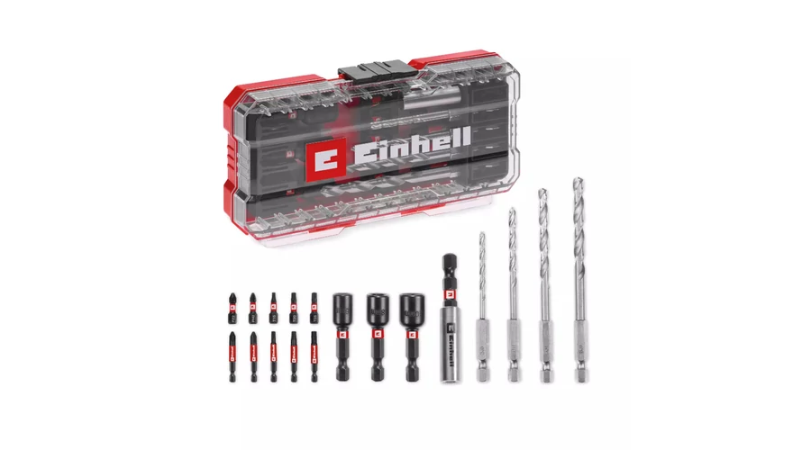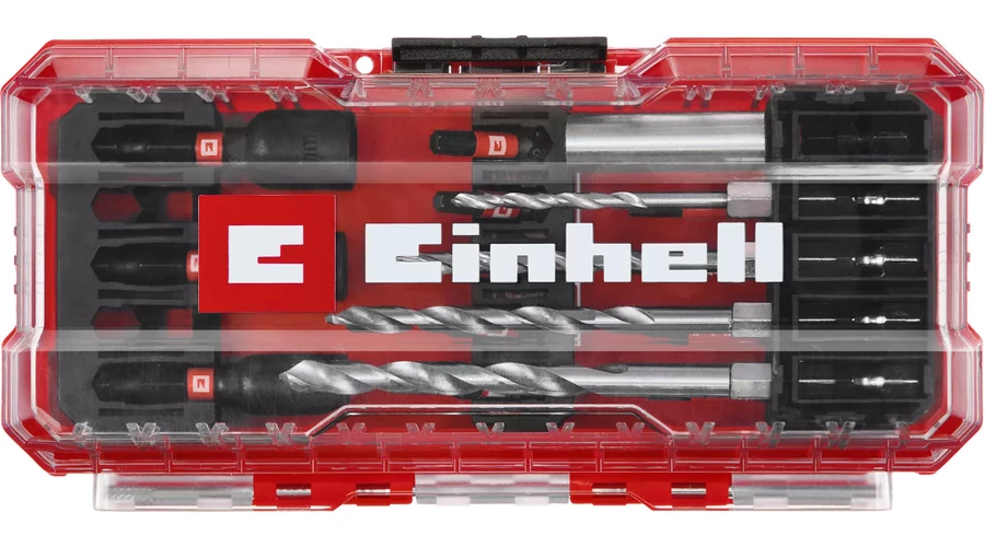 Az Einhell 18 darabos S-Case koffer alapvető felszerelést kínál különféle fúrási és csavarozási feladatokhoz. Öt ütésálló, 25 mm-es bitet tartalmaz C 6,3-as szárral és PH2 / PZ2 / T15 / T20 / T25 behajtóval, valamint további öt darabot E 6,3-as szárral, 50 mm hosszúsággal és PH2 / PZ2 / T15 / T20 / T25 behajtóval. A dugókulcskészlet bitjei robusztus, mangánfoszfátozott S2 acélból készültek, így különösen ellenállóak és hosszú élettartamúak. A bitkészletet négy fémfúró egészíti ki, nagy szilárdságú HSS 4241 acélból. A 3-6 mm átmérőjű fúrók E 6,3-as szárral és 135°-os hasított hegyű heggyel rendelkeznek. A DIN 338 szabványnak megfelelő, hengerelt N típusú spirál hatékony és megbízható forgácseltávolítást tesz lehetővé. A dugókulcskészlet három ütésálló hatszögletű dugókulcsot is tartalmaz 6 / 8 / 10 mm méretben. A dugókulcsok robusztus, mangánfoszfátozott CV acélból készültek, és igényes alkalmazásokhoz alkalmasak. Az Einhell készletet egy 60 mm hosszú, ütésálló, rozsdamentes acél hüvellyel ellátott bittartó teszi teljessé. A bittartó E 6,3-as szénacél szárral rendelkezik, és egy erős mágnessel van felszerelve, amely lehetővé teszi a bitek biztonságos és pontos vezetését. A speciális Einhell-dizájnú praktikus tárolódoboz rendezett tárolóhelyet kínál cserélhető betétekkel az összes tartozék számára. Az átlátszó fedél lehetővé teszi a tartalom áttekintését, míg a robusztus automata rögzítőkapocs biztosítja a doboz biztonságos zárását. Ez azt jelenti, hogy a bitkészlet minden alkatrésze mindig könnyen elérhető. Az (ütve)akkus csavarozókhoz és fúrókhoz tervezett 18 darabos Einhell fém fúrókészlet széleskörű alkalmazási lehetőségeket kínál. Ezért nélkülözhetetlen társnak bizonyul az igényes projektekhez.
