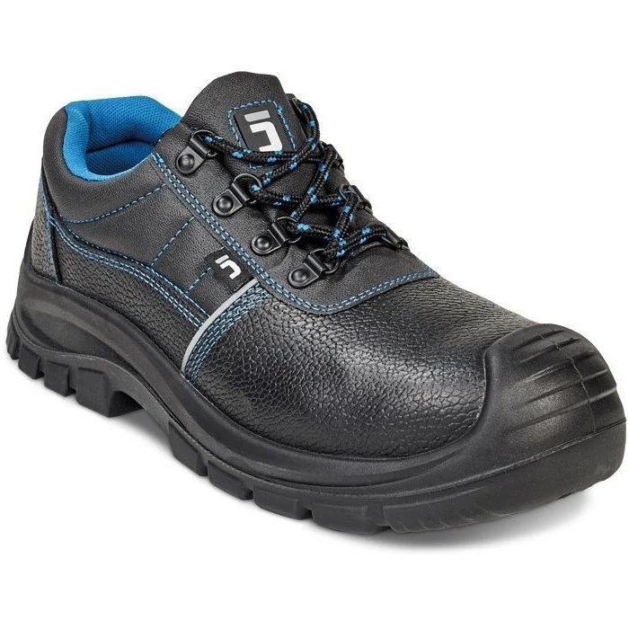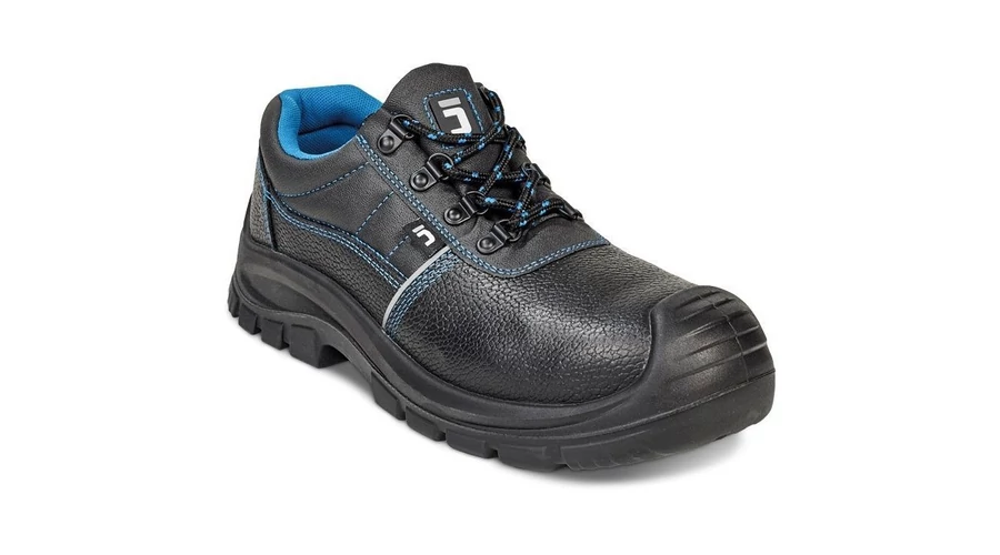 Biztonsági munkavédelmi cipő acél lábujjvédővel és átszúrás ellen védő köztalppal, kétrétegű PU/PU talppal, masszív cipőorrvédővel.