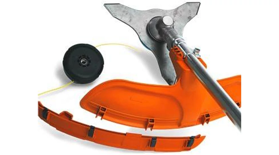 A vágófelszerelés kombinált védőeleme a fűvágó késsel és a vágófejjel egyaránt használható a különböző feladatokhoz.