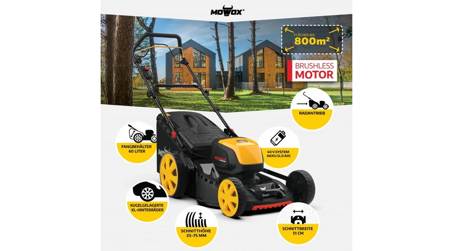 40 V-os szénkefe nélküli motorjával és mindössze 32,8 kg-os súlyával (2 akkumulátorral együtt) a Mowox EM 5140 SX méltó alternatívája a nagyméretű benzinmotoros fűnyíróknak – hihetetlenül erős, ugyanakkor kompakt és praktikus.