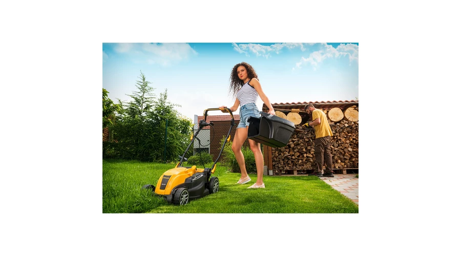 2 az 1-ben funkcióban képes: fűgyűjtésre és hátsó kidobásra. A nagyméretű, műanyag fűgyűjtő kosár kényelmes fogantyúval van ellátva, és praktikus kiegészítő a kosár telítettség kijelző. A gyorsan összecsukható felső tolókar az egyszerű szállításban és tárolásban segít.