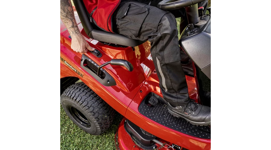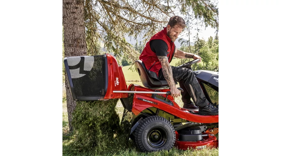 A kiváló felszereltségű jubileumi traktorunk tökéletesen használható a nagyobb kertek hatékony és gyors fűnyírására, köszönhetően a 103 cm-es vágási szélességének. A fűnyíró traktort egy 12,2 kW teljesítményű, masszív és rezgésmentes AL-KO Pro motor hajtja. A vágási magasság egyetlen kézmozdulattal, 6 fokozatban, 30 mm és 80 mm között állítható be. A hosszú élettartamú, acéllemezből készült, egyszerű kézmozdulatokkal kiszerelhető vágóasztalban két kés található a tiszta fűvágásért. A fűnyíró traktor elejére télen hóeke is felszerelhető. Az extra nagy méretű abroncsok mind felületen és terepen jó tapadást és jó előrehaladást biztosítanak. Közvetlenül az állítható vezetőülésből, egyszerűen, egy teleszkópos kar segítségével kiüríthető a 220 liter űrtartalmú fűgyűjtő doboz. Kényelem szempontjából tovább előnyt kínál mind a csúszásmentes kormánykerék, mind az áttekinthető kezelőelemek.