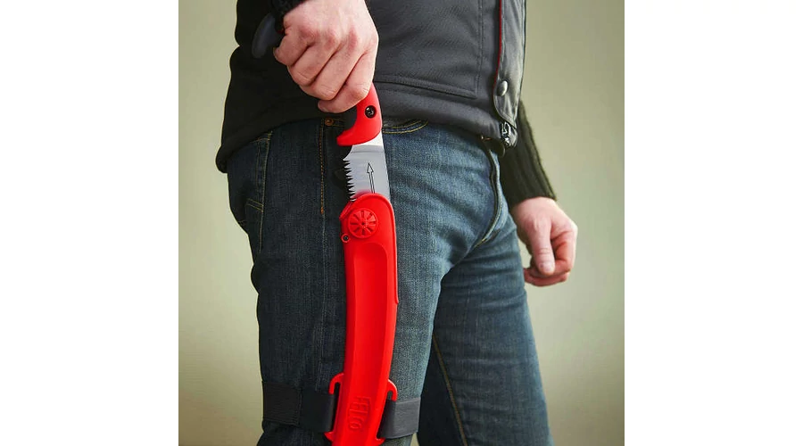 A műanyag tok a fűrészt és a testi épségünket is védi. Fölül egy csattal az övre akasztható, középen a hozzá adott tépőzáras pánttal a combhoz rögzíthető. A véletlen kiesés ellen egy rugózott retesz a tok végén rögzíti a pengét, ami rendkívül minőségi érzést kelt a fűrész kihúzásánál és helyére tolásánál.