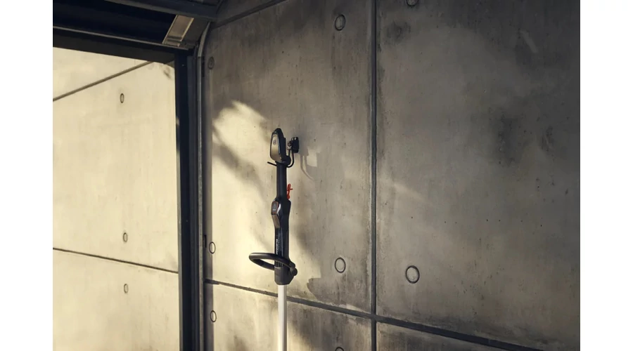 Az egyedi tervezésű tároló akasztót adnak, amelyet közvetlenül a falra lehet szerelni, vagy a Husqvarna Aspire Storage Rail rendszerrel együtt használni. Ezt a szerszámtároló rendszert kiterjesztheti az összes kerti szerszámmal az Aspire sínrendszeren keresztül.