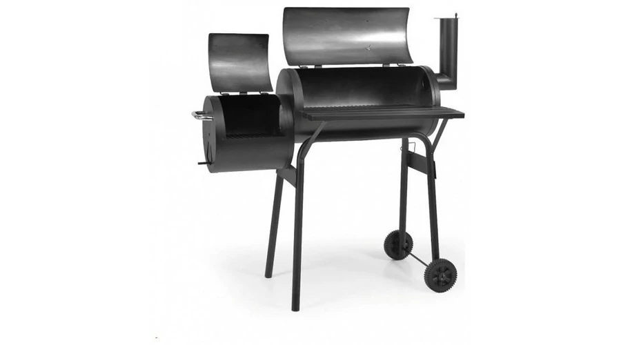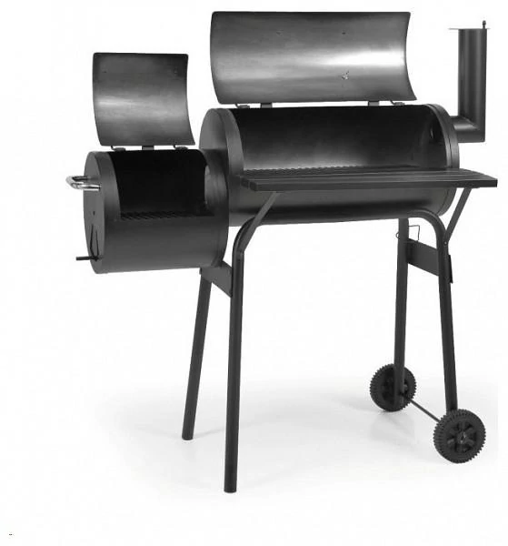 Az acéllapból készült grill kezelve van káros hatások elleni fekete hőálló anyaggal. Két tűztér, háromféle használati mód, hőmérő, nagy tárolópolc