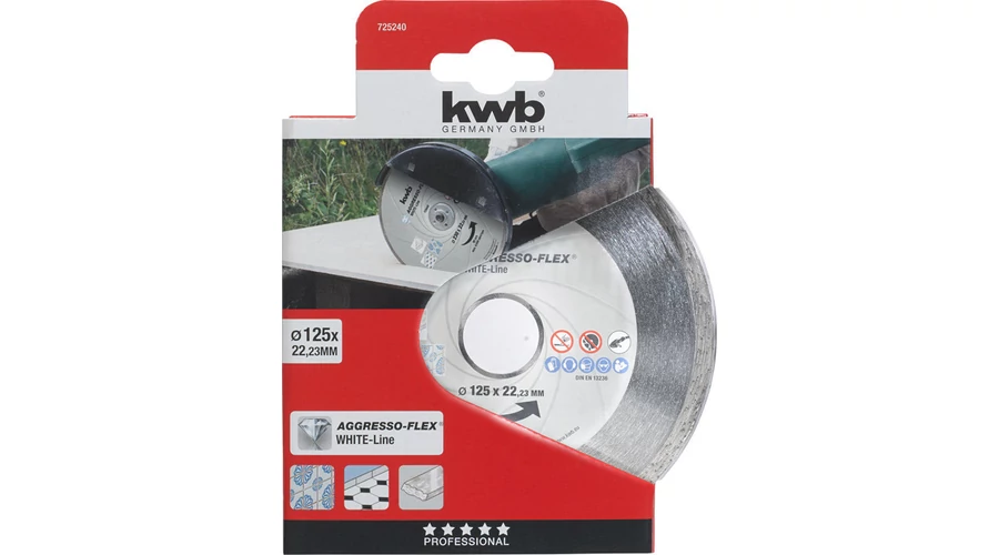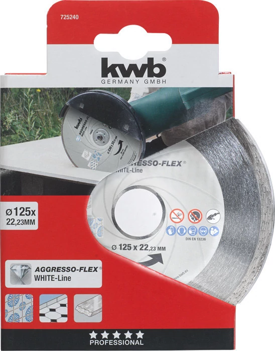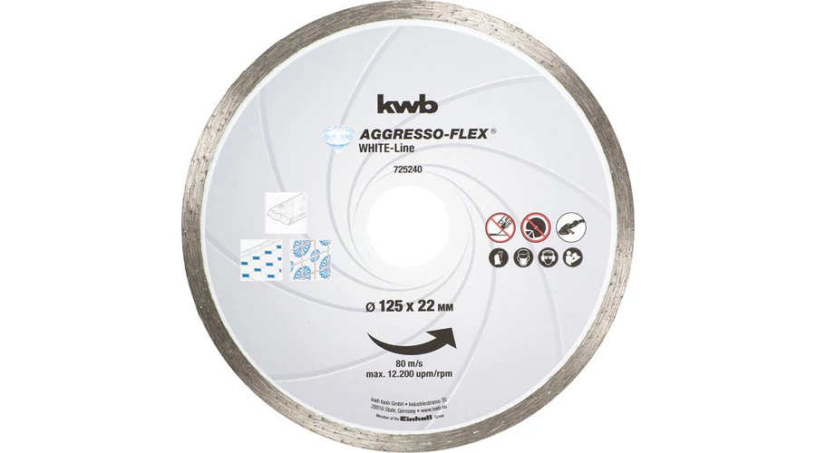 PROFI AGGRESSO-FLEX® WHITE-LINE DIAMOND gyémánt vágókorong, mely magas vágási teljesítménnyel rendelkezik a hosszú távú professzionális használathoz. Tökéletes választás kerámia, travertin, márvány számára.