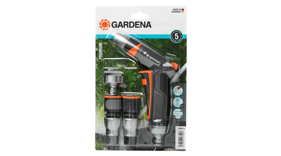 A GARDENA Premium indulókészlet mindent tartalmaz, amire a kerti tömlőhöz való azonnali csatlakoztatáshoz, a tisztítási vagy öntözési feladatokhoz szükséged van. Minden elem az Original GARDENA Systemhez tartozik, amely lehetővé teszi, hogy bármilyen csatlakozóelemhez csatlakoztasd. A kiváló tulajdonságok közé tartozik a minőségi fém-műanyag kivitel, és a modern, kifinomult dizájn, amik garantálják a nagyfokú tartósságot. A Premium locsolópisztoly ideális a makacs szennyeződések eltávolítására vagy öntözésre. Puha műanyag elemeinek köszönhetően kényelmesen és könnyen megfogható a kezében, és teljesen szabályozható. A kioldógomb rögzíthető a hosszan tartó öntözéshez, így elkerülhető a kéz fáradása. A Premium Vízmegállító használatakor a praktikus vízmegállító funkció automatikusan működésbe lép, amint kicseréled a csatlakozóelemet. A vízáramlás ilyenkor működés közben megszakad, és csak akkor indul újra, ha új csatlakozóelemet erősítesz a tömlőre. A Premium Tömlőelem és a Premium Vízmegállítót a robusztus fém szorítóanyákkal rendelkezik és meghosszabbított tömlővezetővel, amelyek különösen nagy tömlőmegtartó erőt biztosítanak. Minden alkatrésszel különösen kényelmes a munkavégzés. Jó ergonómiával és puha műanyag elemekkel (locsolópisztoly), illetve puha műanyagból készült rovátkolt fogófelületekkel (vízmegállító és tömlőelem) rendelkeznek, így még nedves kézzel is biztonságosan, csúszásmentesen használhatók. Minden alkatrész fagyálló, ezért egész évben használható. A készlet Németországban készült és a GARDENA 5 év szavatosságot nyújt rá. Original GARDENA System