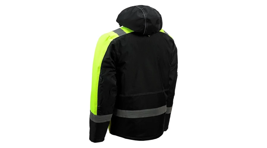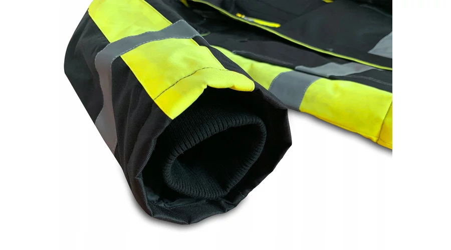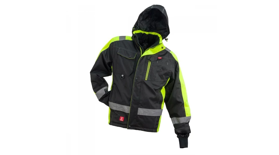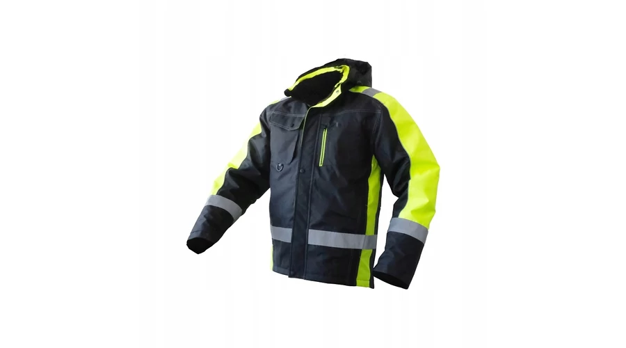 Anyaga:100% poliészter, bélés: 100%poliészter, kapucnis, neon csíkos + fényvisszaverő csíkkal ellátott bélelt kabát. Vízlepergető bevonattal.
