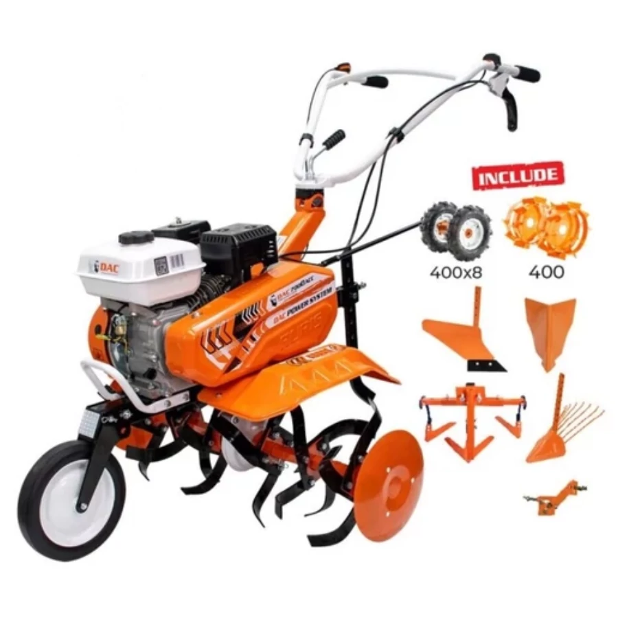 A DAC 7000K félprofesszionális talajművelő a tartozékok széles skálájának felszerelését teszi lehetővé, mint például: egybarázdás eke, borona, burgonyaeltávolító, kultivátor, hóvágó, dobos kaszarendszer, vetőgépek, fém vagy gumi kerekek, teherhordó pótkocsi 500 kg-ig.