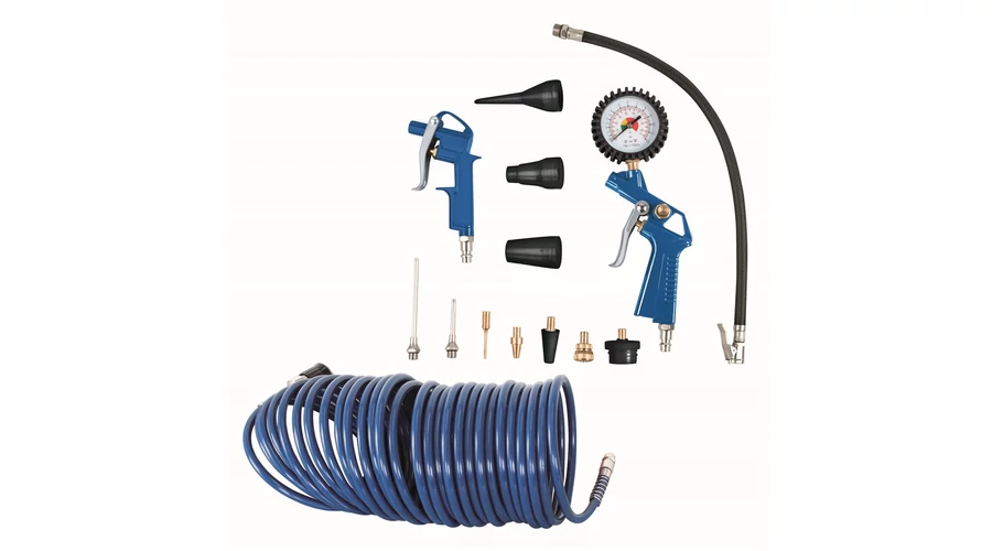 Kibővített kompresszor kiegészítő szett gazdag fúvóka kínálattal és spirál tömlővel. A kiegészítők minőségi anyagokból készülnek és gyorscsatlakozókkal vannak ellátva.