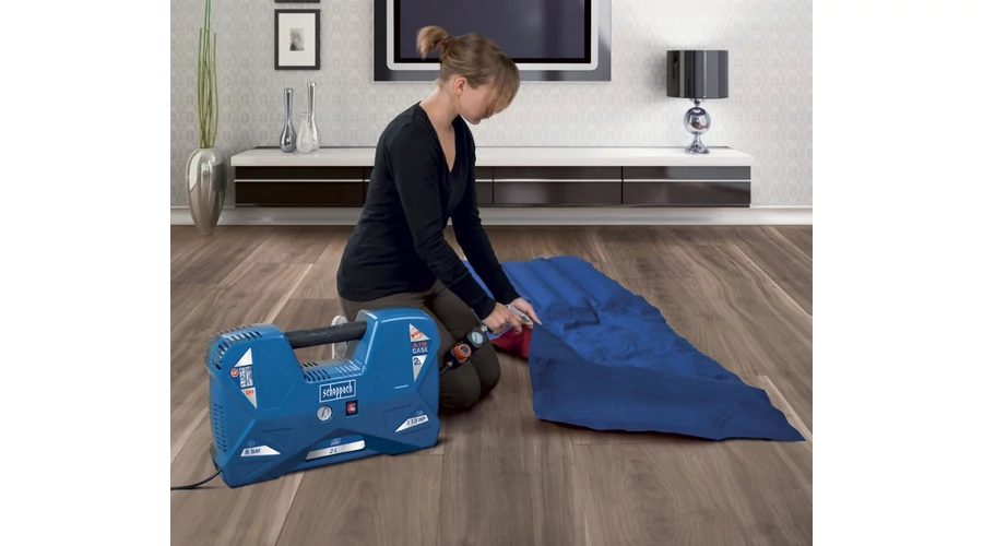 Az AIR CASE kicsi, helytakarékos, csendes, könnyű, de ennek ellenére erős és gazdagon felszerelt kitűnő kompresszor. Kiváló segítség nyújt minden háztartásban, hétvégi házban, lakókocsiban vagy kiesebb műhelyben. A standardon felüli tartozékok tartalmazzák a 2 l-s levegőtartályt, amelynek segítségével elektromos áram nélkül is felfújhatja a kerékpárját a pincében, a 9 különböző csatlakozó segítségével felfújhatja a labdákat, gumikerekeket, matracokat, vagy akár a felfújható medencét is. Tartalmazza továbbá a 3 m hosszú nagynyomású tömlőt integrált manométerrel és nyomásszabályozóval, valamint a praktikus fúvópisztolyt, a tartozékok integrált tárolási lehetőségét, a kényelmes fogantyút és a tartály nyomásmérő manométerét is. A kompresszor a legmodernebb olajmentes technológiával készült motorral van felszerelve. Az olajszint ellenőrzése, utánpótlása vagy cseréje teljesen szükségtelen, és a kompresszor így is mindig készen áll a munkára. A mérete, és összesen 8 kg súlya miatt használata ideális a kempingezéshez vagy más szabadtéri tevékenységekhez.