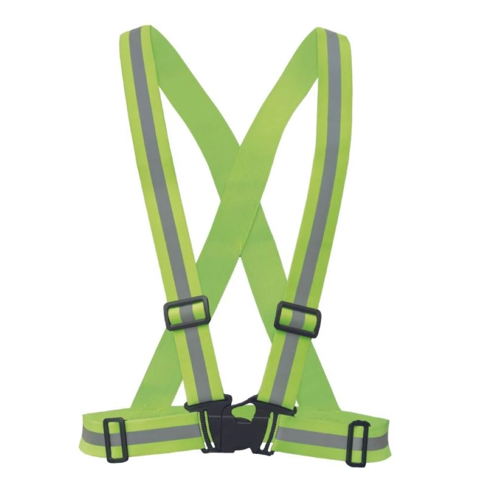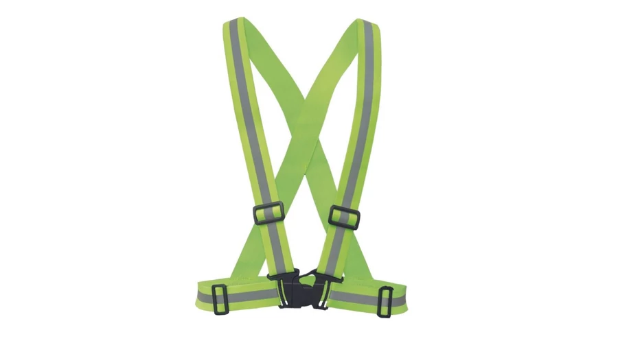 Anyaga: 100% poliészter, heveder szélesség: 3,7 cm. Műanyag csattal rögzíthető, fényvisszaverő csíkokkal ellátott.