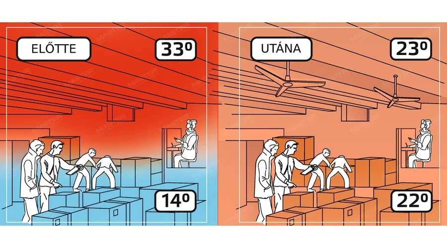 A meleg levegő a mennyezet alatt gyűlik össze. A Master mennyezeti ventilátor a meleg levegőt az alsó részekbe juttatja, aminek köszönhetően körülbelül 30% energia takarítható meg.