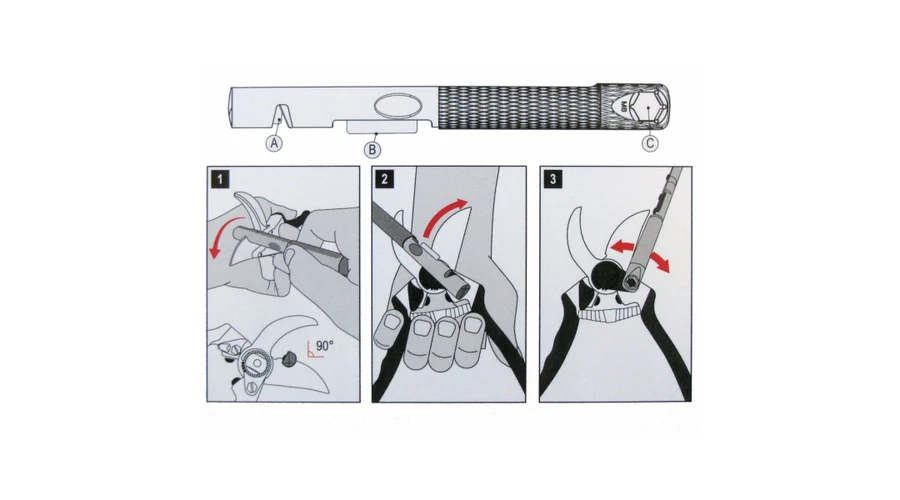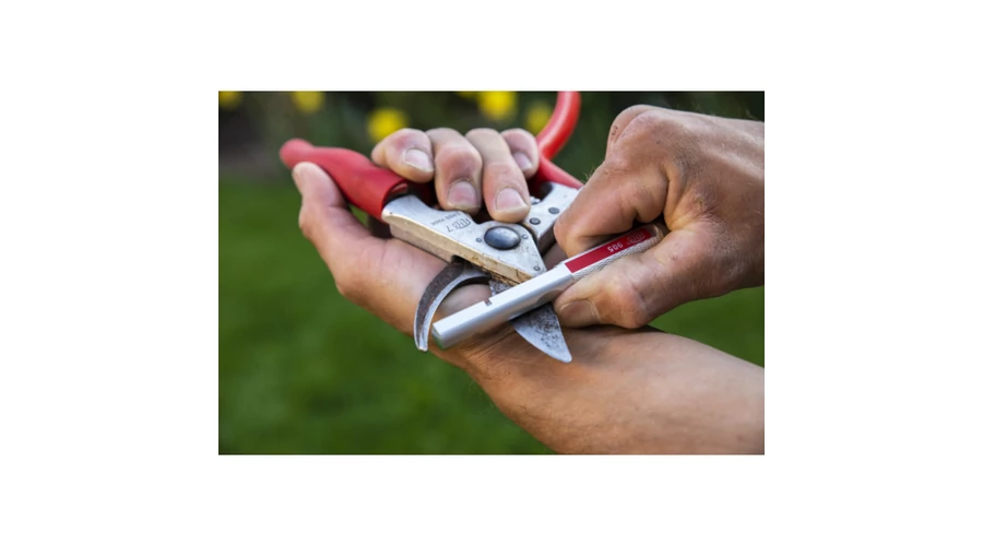 Az ollók szorosságát húszfogú anyacsavarral lehet az ideálisra hangolni, és ott rögzíteni. Ehhez egy apró szerszámot is kapunk a csomagban, ami a csavarhúzót és a csillagkulcsot is helyettesíti, és mindig a zsebünkben lehet. A hernyórugó határozottan és gyorsan nyit, ami fontos a biztos kézben-tartáshoz és a tempós munkához. Az ollók zárása és nyitása központi, hüvelykujjas. Az egész napi munka után érdemes az ollót megtisztítani, a vágópenge élét fenőacéllal vagy vídiával lehúzni, és egy csepp olajjal újra kenni a pengék összeérő felületét és a hernyórugót. Egy heti folyamatos metszés után indokolt a vágópenge finom fenőkővel való élezése.