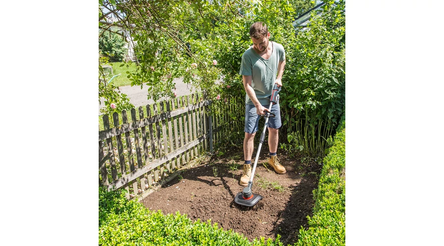 A robusztus, 4x4-es fém vágótárcsa 200 mm-es munkaszélességgel és 150 mm-es pengeátmérővel lazítják fel veteményeskertjét. Könnyű, akkumulátorral együtt 3,8 kg-os súlyának köszönhetően kis fáradtsággal dolgozhat. A körben zárt fogantyú is jó kezelhetőséget biztosít.