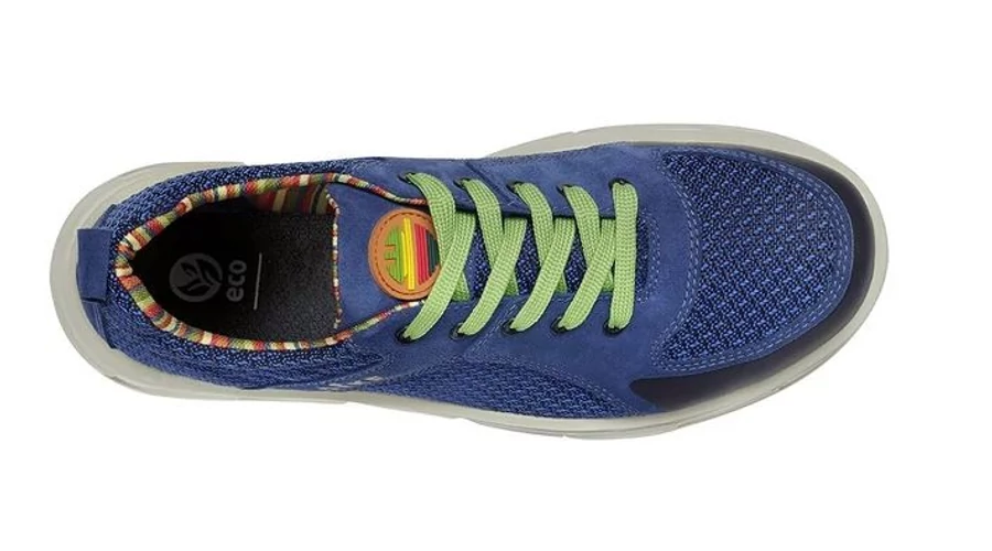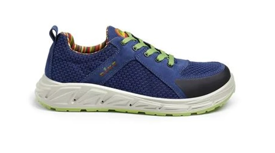 DIKE RELOAD RUNNER S1P ESD kék, velúr bőr/újrahasznosított PET anyagú munkavédelmi cipő, Solidbreath® légzésaktív bélés, csúszásmentes kétrétegű újrahasznosított PU talp, anatómiai talpbetét, ALUFORCE® újrahaszn.alum. kapli és HighSafe-Tex® fémmentes talplemez, ESD védelem
