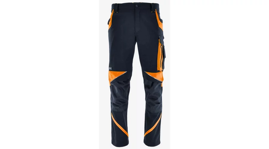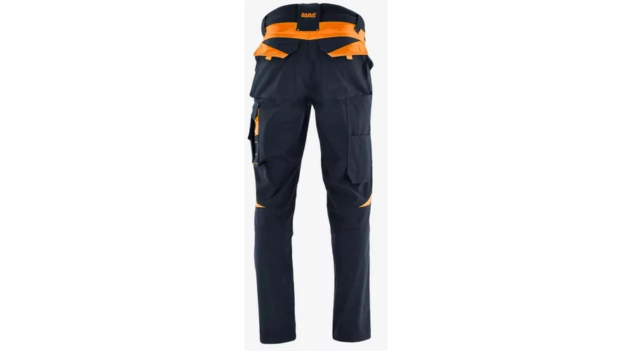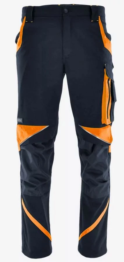 Gombbal rögzített nadrág, a derékrész oldalán elasztikus pántokkal, öv számára kialakított bujtatókkal, több különböző funkciójú zsebbel, térdpárna behelyezésére szolgáló tépőzáras zsebbel, térd résznél fényvisszaverő csíkokkal. Anyaga: Canvas Active - 58% pamut/40% poliészter/2% spandex - speciális szövésű anyag, melyben a spandex két irányban ad rugalmassági lehetőséget a szövetnek. Anyagvastagság: 260g/m2