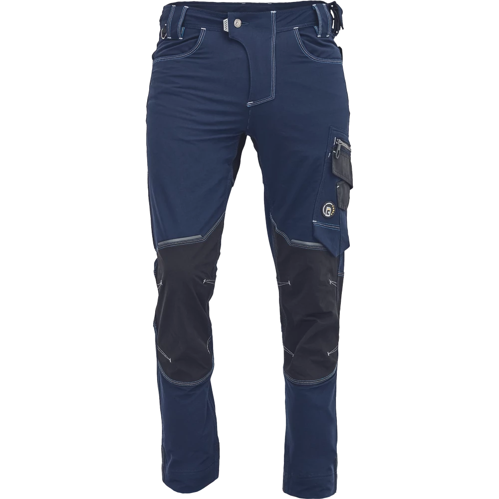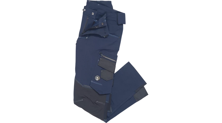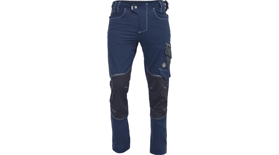 férfi munkanadrág innovatív, rugalmas TRIFIBETEX PRO® anyagból, elöl 2 ékzseb, hátul 2 tépőzáras foltzseb, bal oldalt nagy multifunkciós zseb, jobb oldalt multifunkciós vonalzó, kés és ceruzatartó, fém "D" gyűrű, rugalmas derék, hosszabbítható szárhossz, fényvisszavető elemek, dekoratív tripla varrás kontrasztos színnel, kalapácstartó