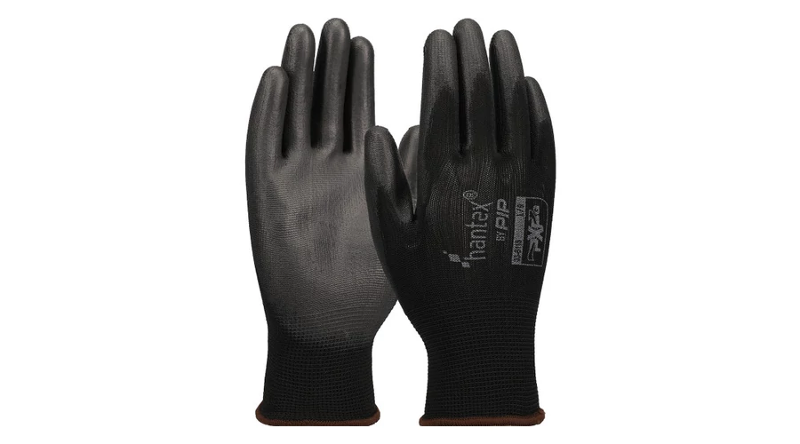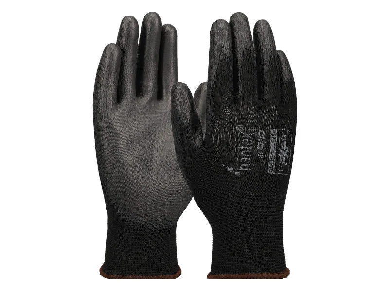 13 gauge, fekete, varratmentes poliészter kesztyű sima PU tenyérmártással a kiváló kopásállóságért és tapintásérzékenységért.