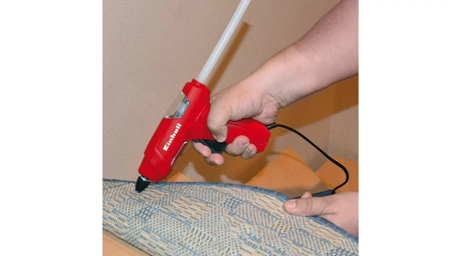 A forró ragasztópálcák mechanikus adagolása a célzott alkalmazáshoz Ergonómikus fogantyú a fáradtságmentes munkához Forró ragasztórudak vezetője kilátóablakkal Biztonsági állvány a tartókonzolnak köszönhetően