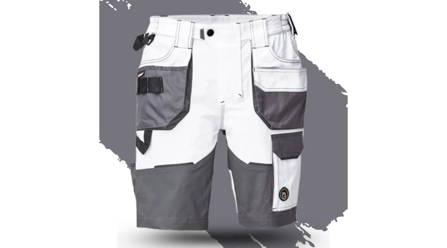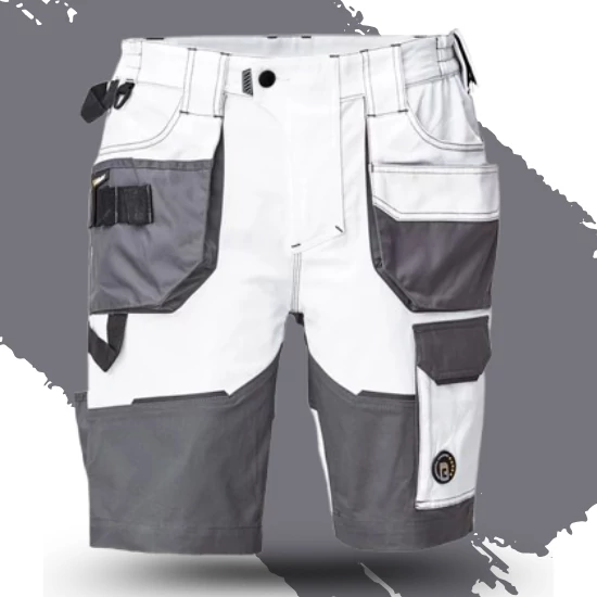 Kevertszálas, kopásálló anyagból elasztán hozzáadásával készült, kéttónusú munkás rövidnadrág, kalapácstartó pánttal, Cordura erősítéssel, jól láthatósági elemekkel, ülep erősítéssel
