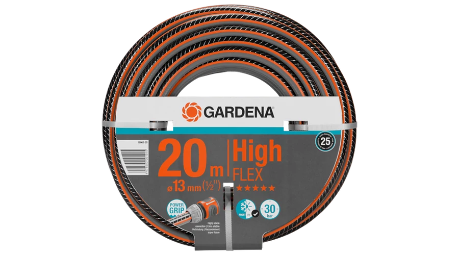 A GARDENA Comfort HighFLEX tömlő Power Grip bordázattal tökéletes csatlakozást biztosít a tömlő és a tömlőelem között. Az új technológiának köszönhetően egymásba illenek, mint a fogaskerekek. A Power Grip bordázat lehetővé teszi sok kerttulajdonos régi álmát; a megbízható kapcsolatot, tökéletes tartóerővel. A bordázott felület pozitív mellékhatása, hogy a tömlőt könnyebb feltekerni és jól csúszik. A sűrű, kiváló minőségű spirálhálós szövetnek köszönhetően, melyben két spirálszál egymással ellentétes irányban fut, a tömlő nyomásálló és alaktartó, egyúttal sokkal rugalmasabb felhasználáskor, mint a Comfort FLEX tömlő. Ez a spirálok sűrűségének köszönhető, ami a tömlőt még rugalmasabbá és könnyebben kezelhetővé teszi. A tömlő nem csomózódik vagy csavarodik. Mindezek a legjobb előfeltételeket nyújtják az egyszerű és sokoldalú felhasználáshoz a kertben. Szükség esetén az Original GARDENA System csatlakozóelemeihez és öntöző eszközeihez kitűnően használható. Nem tartalmaz káros lágyítókat (ftalátokat) és nehézfémeket és természetesen UV ellenálló. Vastag fala különösen robusztussá és tartóssá teszi. 30 bar repesztő nyomás.