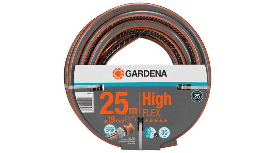 A GARDENA Comfort HighFLEX tömlő Power Grip bordázattal tökéletes csatlakozást biztosít a tömlő és a tömlőelem között. Az új technológiának köszönhetően egymásba illenek, mint a fogaskerekek. A Power Grip bordázat lehetővé teszi sok kerttulajdonos régi álmát; a megbízható kapcsolatot, tökéletes tartóerővel. A bordázott felület pozitív mellékhatása, hogy a tömlőt könnyebb feltekerni és jól csúszik. A sűrű, kiváló minőségű spirálhálós szövetnek köszönhetően, melyben két spirálszál egymással ellentétes irányban fut, a tömlő nyomásálló és alaktartó, egyúttal sokkal rugalmasabb felhasználáskor, mint a Comfort FLEX tömlő. Ez a spirálok sűrűségének köszönhető, ami a tömlőt még rugalmasabbá és könnyebben kezelhetővé teszi. A tömlő nem csomózódik vagy csavarodik. Mindezek a legjobb előfeltételeket nyújtják az egyszerű és sokoldalú felhasználáshoz a kertben. Szükség esetén az Original GARDENA System csatlakozóelemeihez és öntöző eszközeihez kitűnően használható. Nem tartalmaz káros lágyítókat (ftalátokat) és nehézfémeket és természetesen UV ellenálló. Vastag fala különösen robusztussá és tartóssá teszi. 30 bar repesztő nyomás.
