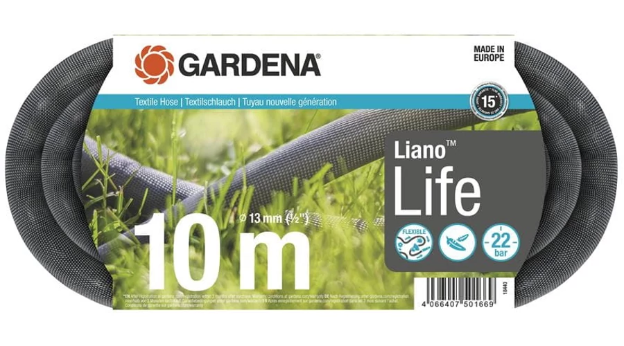 A GARDENA Liano™ Life 10 m-es textiltömlője a mindenes a kis kertekben vagy az erkélyeken történő rövid és közepes időtartamú öntözéshez. A 13 mm (1/2") átmérőjű tömlő gyorsan használatra kész a készre szerelt Original GARDENA System rendszerelemekkel, a Liano™ tömlőelemnek és a Liano™ vízmegállítónak, és nem utolsósorban a rugalmas textilszövetnek köszönhetően. A rugalmas belső PVC tömlő teljesítménye megbízható, az ellenálló textilszövetből készült innovatív külső tömlő pedig növeli az élettartamot. A Liano™ Life-ot kiemelkedő rugalmasság jellemzi, ami segít például a kert öntözésében vagy a takarításban. Könnyen manőverezhetsz vele a talajon, mivel rugalmas, ezért kevésbé valószínű, hogy fennakad vagy megcsavarodik. Akár 50%-kal könnyebb, mint a hagyományos PVC tömlők, így akár hosszú ideig is kényelmesen a kezedben tarthatod. Emellett kellemes tapintása miatt komfortos a használata. Jó rugalmasságának köszönhetően a tömlő könnyen igazodik a meglévő tárolóhelyéhez, így egyszerűen és kompakt módon tárolható. A Liano™ Life szakítószilárdsága 22 bar. Mivel a tartós tömlő UV- és fagyálló, egész évben a szabadban tárolható. A Liano™ Life káros anyagoktól mentes: ftalát- (<0,1%), kadmium-, ólom- és báriummentes (<0,1%). A minőségi Liano™ Life textiltömlő Európában készül, és a GARDENA 15 év gyártói garanciával támogatja, ha regisztrálsz a gardena.com/registration oldalon a vásárlást követő 3 hónapon belül. Szélsőségekre felkészítve. A mindennapokra tervezve. Liano™ textiltömlők.