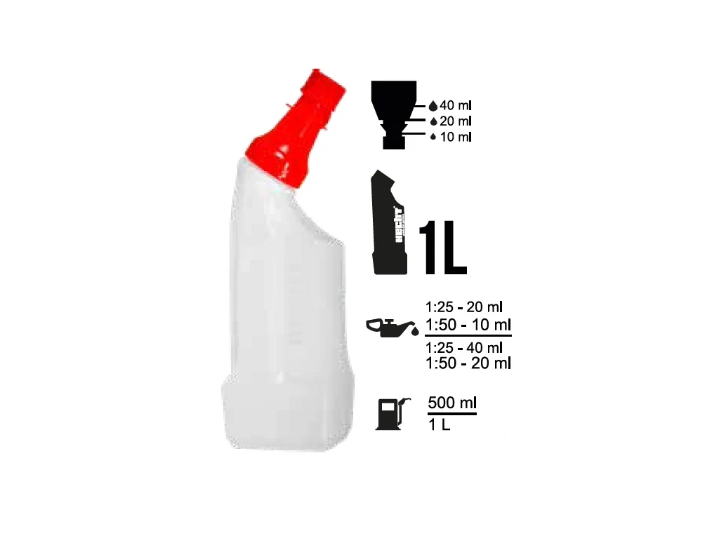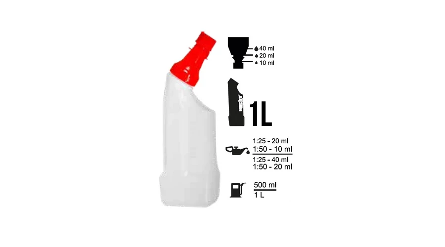 Univerzális keverőedény, amely alkalmas benzin-olaj keverék keverésére 2 ütemű motorokhoz.