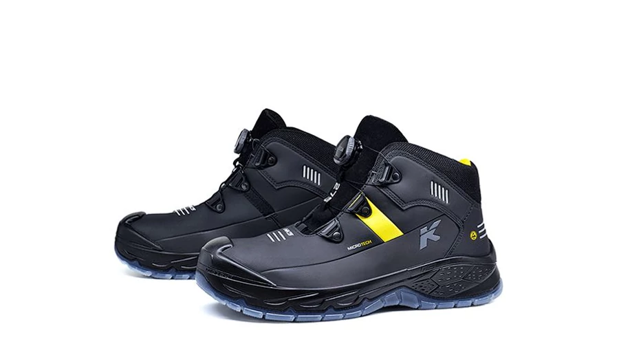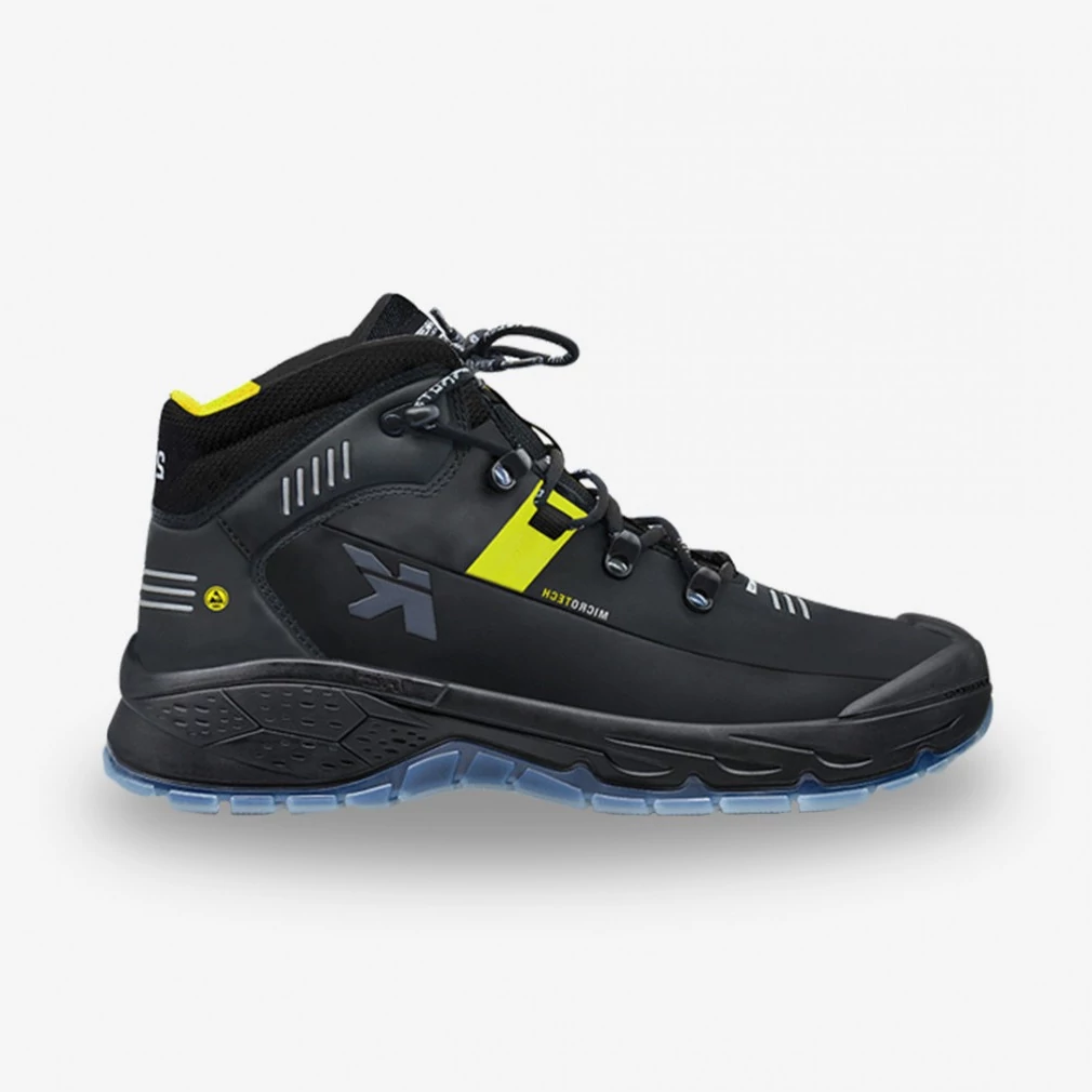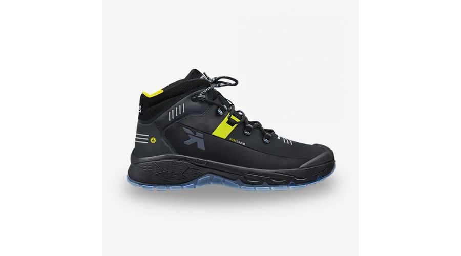 Könnyű, lélegző, extrém rugalmas munkacipő acél kaplival, speciális Boa L6 fűző rendszerrel a precíz és gyors beállításért, talpátszúrás elleni védelem: T-527 extra rugalmas, extra könnyű speciális kevlár, cipőfelsőrész: vegán mikrofibra, fényvisszaverő csíkokkal, az orrán poliuretán védelem a kopás megelőzésére, bélés: fekete/sárga textil, távtartó hálóval kiváló légáteresztő és verejtékelnyelő tulajdonsággal, talpbetét: ESD Comfort, energialenyelő tulajdonsággal, ortopédiai igények szerint átalakítható (DGUV 112-191 német szabvány), cipőtalp: Running Star TPU/PU hullámvonalas struktúra a kiváló rugalmasságért, extra párnázottsági érzés az ütések és nyomások optimális csökkentése érdekében, antisztatikus, norma: EN ISO 20345:2011, ESD Tanúsítvány EN 61340