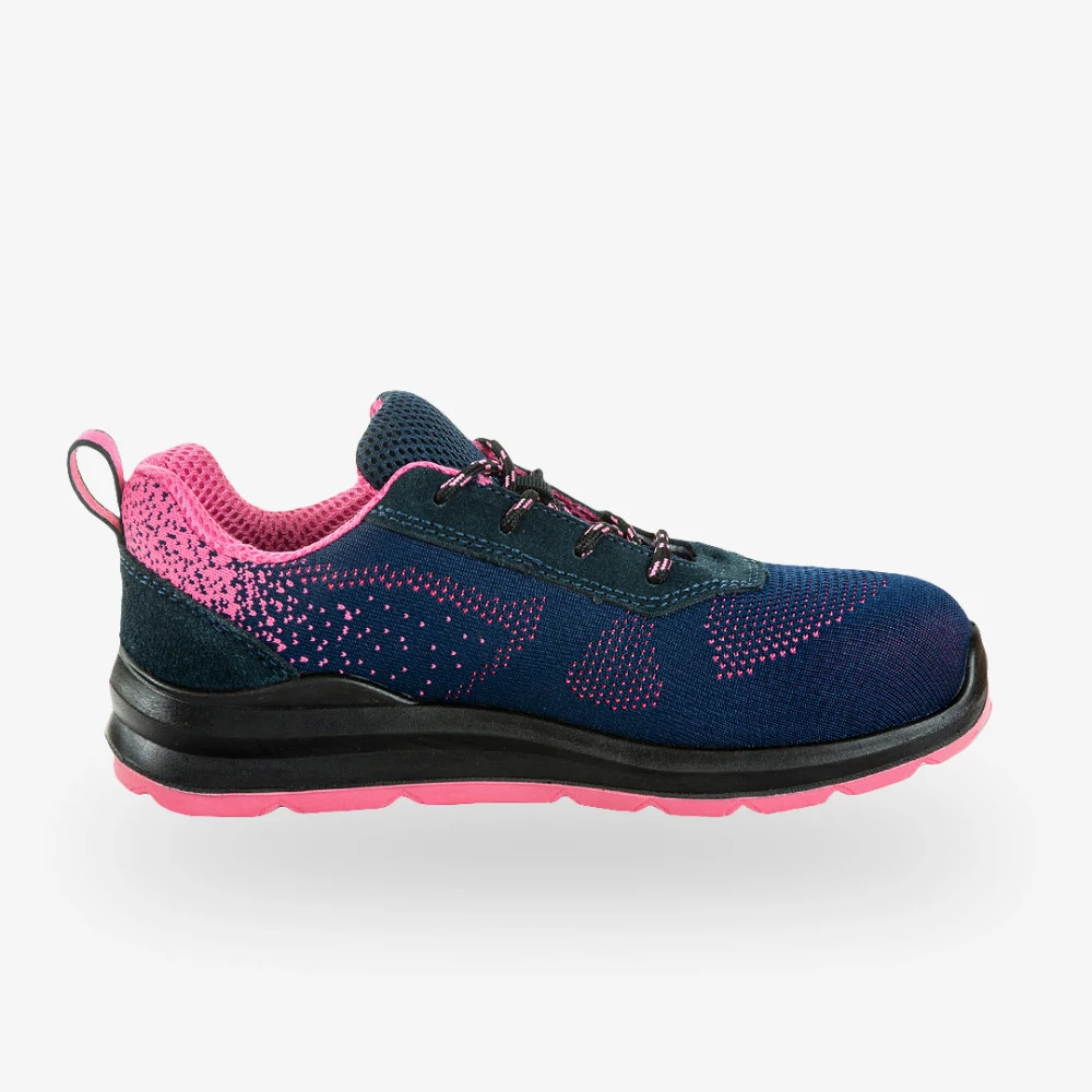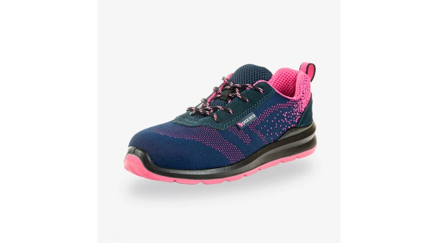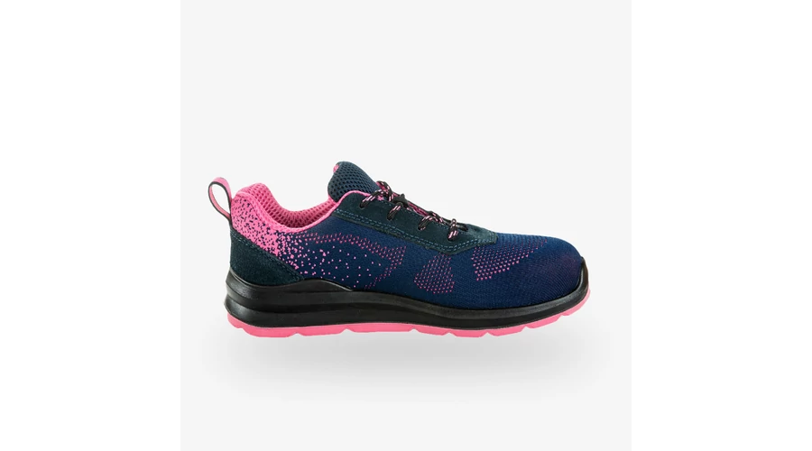 Sportos női munkavédelmi cipő acél orrmerevítővel, amely megvéd a leeső tárgyak ellen. Zárt sarokfelület. Talpa PU készült, csúszásgátló, olajálló, antisztatikus.